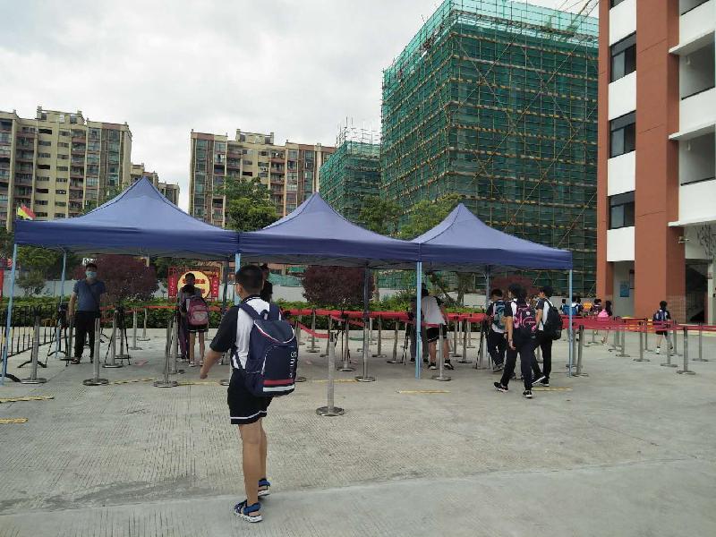 图1:有4位教师在测温点检查师生是否有体温异常