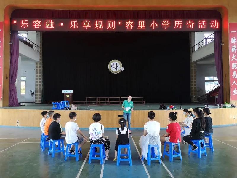 7月4日,顺德启创“乐?容?融”新市民子女成长支援计划项目社工在容里小学礼堂,为学校16名新市民子女开展了“乐?容?融”?乐享规则历奇活动。社工采用历奇辅导的手法,提高参加者遵守规则的意识,包括:尊重他人、礼貌待人、学会有效且理性的沟通以及了解等待的重要性。