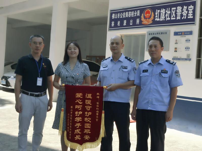 2020年7月14日下午,容桂红旗中学党委书记、校长陈亚玲携行政班子一行专门来到容桂红旗警务室,送上印有“爱心呵护学子成长 温暖守护校园平安”的锦旗,对红旗警务室日夜为学校的安全稳定工作给予的帮助和指导表示感谢。