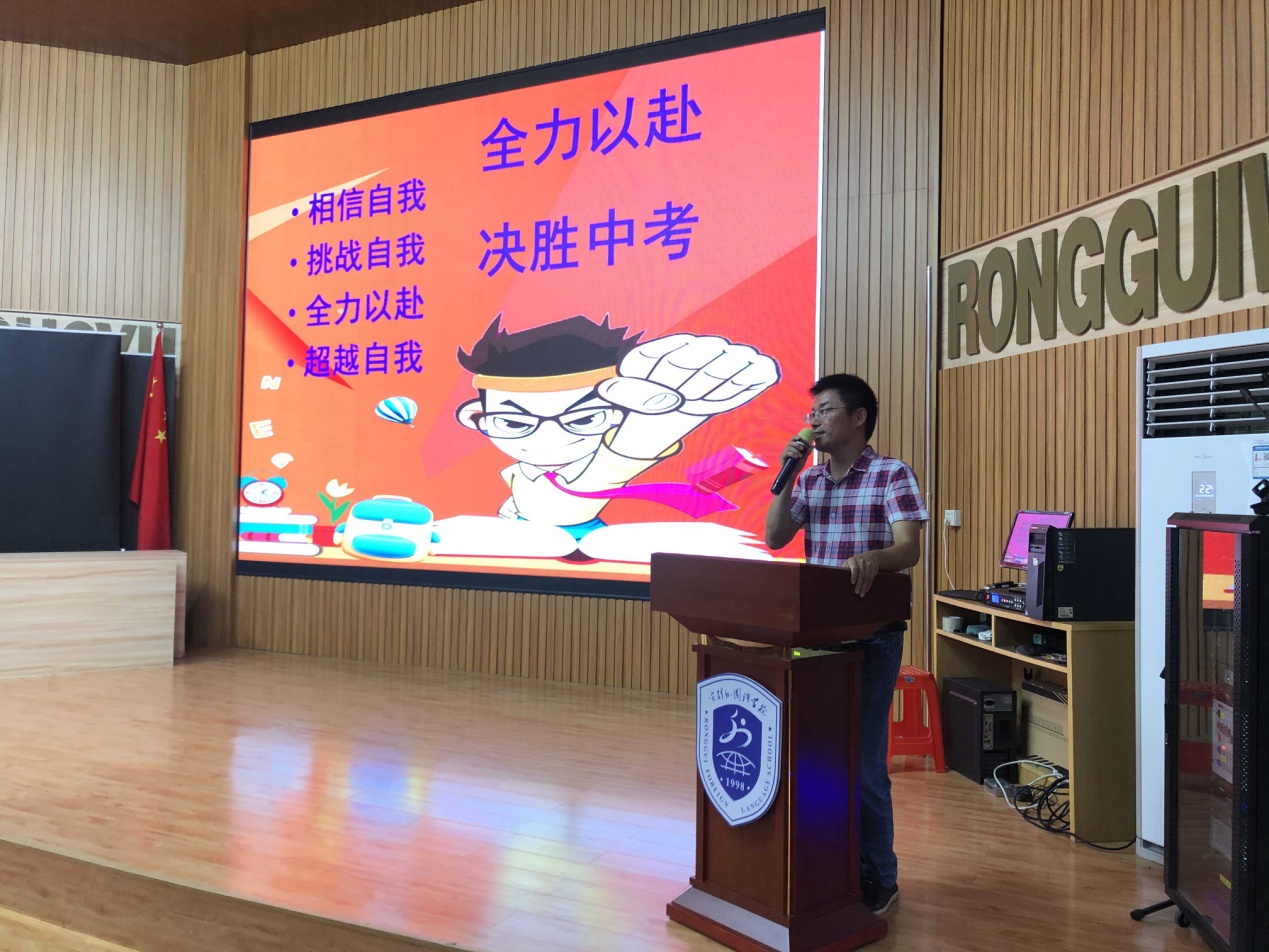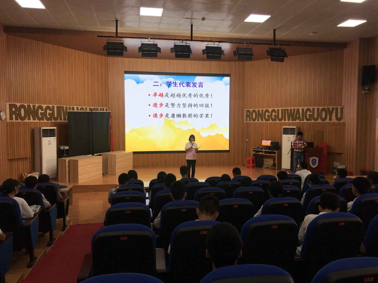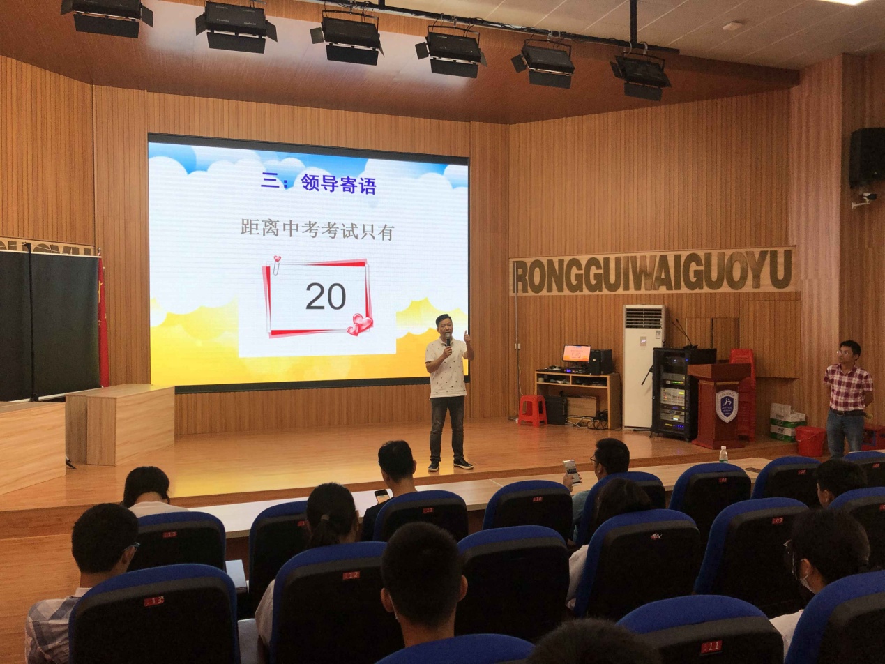 会议开始由学生代表发言,分享他们的学习经验,并送上他们的中考祝福,寄语容外学子必定旗开得胜,马到功成!