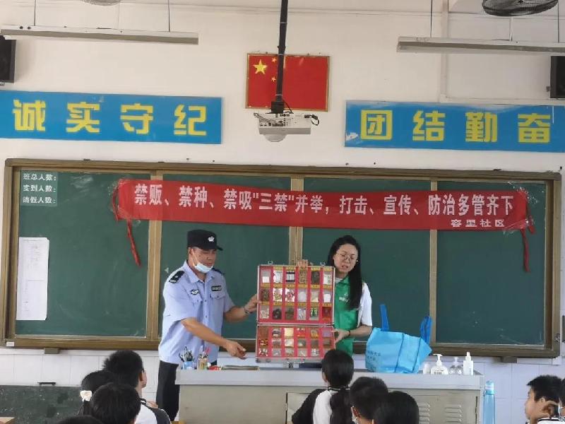 容桂派出所新地社区民警中队郭德雄警长的带领下,容桂派出所综合室和容桂派出所刑警队应邀来到我校六年级,为六年级的学生开展了主题为“反诈先锋 有我无骗”和“禁贩、禁种、禁吸‘三禁’并举,打击、宣传、防治多管齐下”的教育,郭警长亲自做主持,现场给学生讲述了被诈骗的案例,并告诉学生如何与不法分子斗智斗勇;另外给刑警队成员给学生展示了毒品模型,让学生认识到毒品的危害,感受到不法分子的隐晦。学生在警员们声情并茂的合力教育下,增强了自身的法律意识,用法律武装起来的学生们将更有智慧!而容里小学的安全教育也将警钟长鸣!