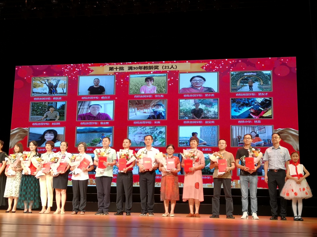 傅新波、赖百灵、李红梅、梁小英、梁友才、刘词林、鲁业繁宋爽、巫莹英荣获“满三十年教龄奖”