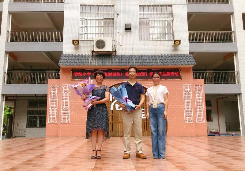 之后,活动迎来“给辛勤的园丁”献花环节。首先,是彭海云校长为容边小学退休的吴校长献上美丽的鲜花,感谢他半辈子用心做教育,做学生的引路人。接着,容边小学容雅礼仪队队员为各科组老师们依次献花,并由彭海云校长为全体老师颁发教师节纪念贺卡。最后,彭海云校长为“三十年教龄”的老师冯城发副校长和李绮雯副校长献上献花,感谢他们为教育事业奋斗了三十年,付出了自己的青春,辛劳耕耘。