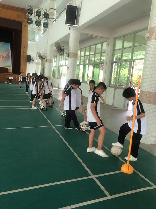 学生练习足球脚内侧传球
