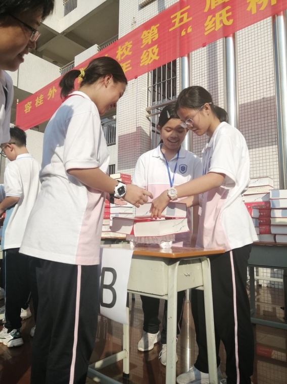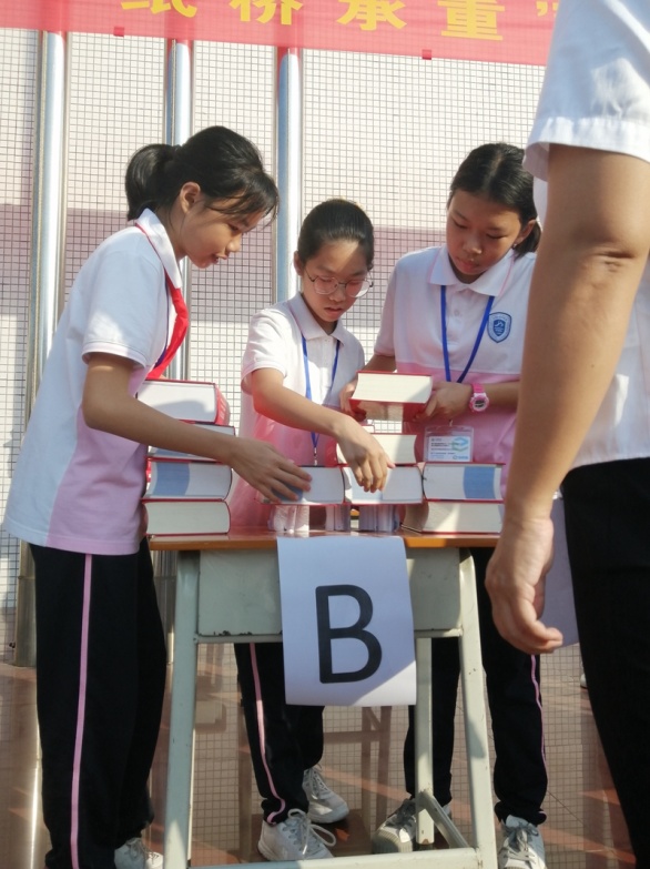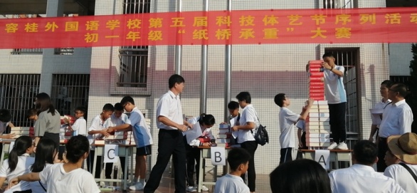 原来现场正在举行容桂外国语学校第五届科技节系列活动之初一年级“纸桥承重”大赛。