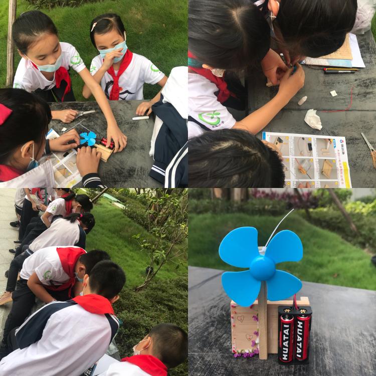 最后同学们在小黄圃小学老师的示范下开始制作小风扇实验,学生们两人一组合作制作,小组两人一起研读说明书,既分工合作又亲密无间地快速将小风扇组装起来。组装完风扇之后,就开始创作诗歌,诗歌创作完后同学之间相互交流讨论进行自我修改。谢志颖主任和黎珍弟老师则针对学生修改后的作品进行适当的点拨,进行第二次的修改。最后让同学们把诗歌抄在做好的小风扇上。
