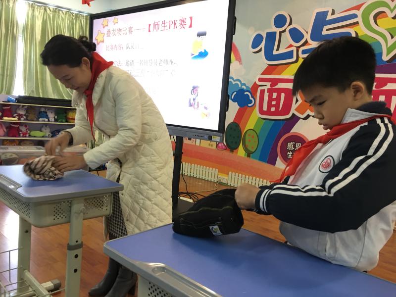 容桂小学中队辅导员何燕静上队活动示范课,主题是《我是叠衣小能手》。这节活动课紧紧围绕容桂小学的家庭劳动课程进行。何老师用活泼丰富的形式展示了衣服、裤子的不同叠法,并通过现场展示和PK等方式,检查孩子们的劳动技能掌握情况。贴近生活的选材,有趣的活动形式,让二年级的小队员们在掌握技能的同时感受到了劳动的乐趣。