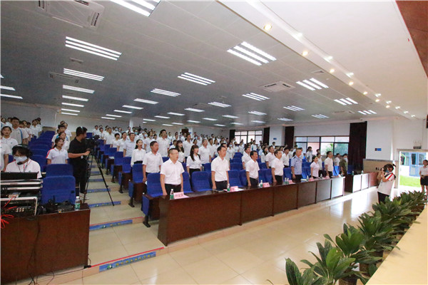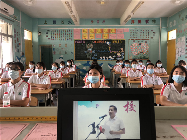 特殊时期的特殊学期,在线下复学的两个月后迎来了特殊的散学礼,2020年7月17日上午,陈村职业技术学校举行了线上线下相结合的2019学年第二学期期末总结表彰暨散学典礼,主会场设在综艺楼报告厅,分会场是各班教室,主会场的盛况通过网络直播现场分享到各个分会场。 陈村镇消防中队队长、陈村职校消防校长程巍,学校全体行政、教师及学生代表在主会场观礼。 散学典礼由司徒葵东副校长主持,在雄壮的国歌声中拉开帷幕。