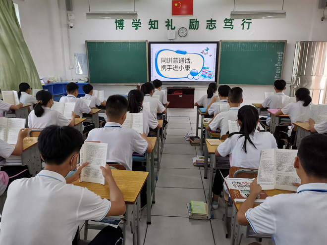 结合推普周活动主题,江义中学九年级师生根据班级特点,开展以“同讲普通话,携手进小康”为主题的经典诵读活动和以“同讲普通话,颂抗疫英雄”为主题的班级普通话演讲比赛,以此促进学生自觉练习普通话,提高普通话水平。