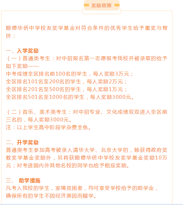 这里有广阔无边的发展前景。学校定位卓越。是广东省南粤革命老区英才计划基地学校,是佛山市“精品高中创建学校”(顺德区仅有三所)顺德区“优质品牌高中”;成立了以华侨中学为核心的高品质的小初高贯通的华侨教育集团;设立了顺德首创的“港澳台生班”;参加国际中学生信息及通讯科技大赛(INFOMATRIX),获世界金奖;是华南理工大学、东南大学等近十所名校的优质生源基地;与中山大学、北京师范大学、华南理工大学、华南师范大学、暨南大学、中山纪念中学、执信中学、湖南师范大学附属中学等国内名校开展教育教学合作,设立精英班、创新班,开展创新人才培养实验项目。