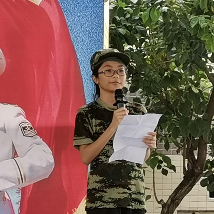 杏联中学初一(1)班李锦欣同学代表全体新生表达了在社会综合实践活动期间服从命令、听从指挥、吃苦耐劳、挑战自我的坚定决心。