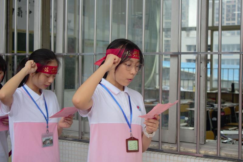 继而,初三(10)班余芷琪、初三(6)班肖田田同学带领全体同学进行宣誓。