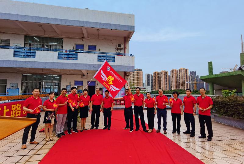 瞬时,同学们那渴望而又激动的眼神聚焦于“成功门”,仿佛那就是心之所盼的未来!各班的领队同学都默默地紧握班旗的旗杆,在班主任的带领下,同学们整理好额上的红丝带,边气势如虹地高喊口号边有序地走过“成功门”。“成功门”两侧早有初三级的科任老师列队静候着,他们为初三学子摇旗呐喊,击掌壮行,为这庄严的场面增添了一份温情!
