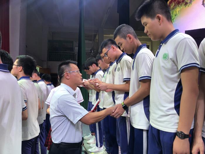 最后,九年级郑振飞级长把寓意着九年级精神的旗帜交到八年级麦景志级长手上,同时也把九年级坚定的信念和奋斗的精神传递给八年级的学子们。