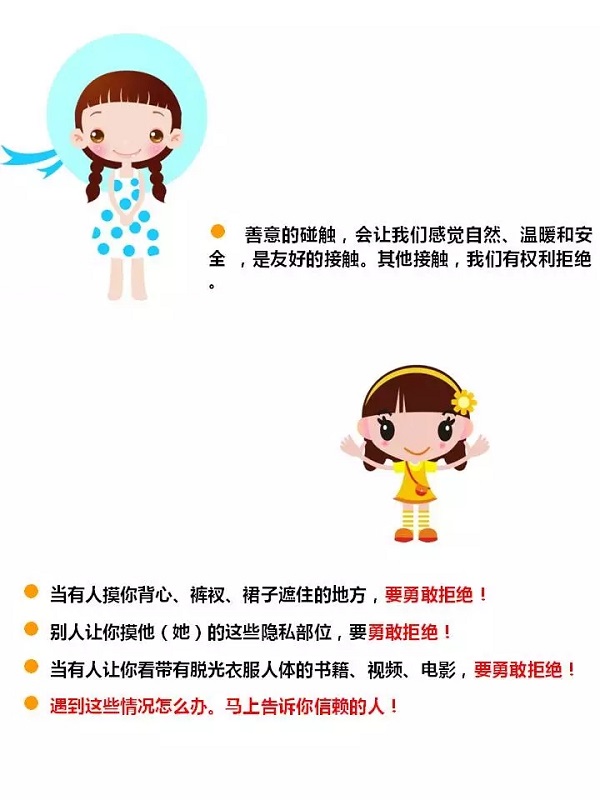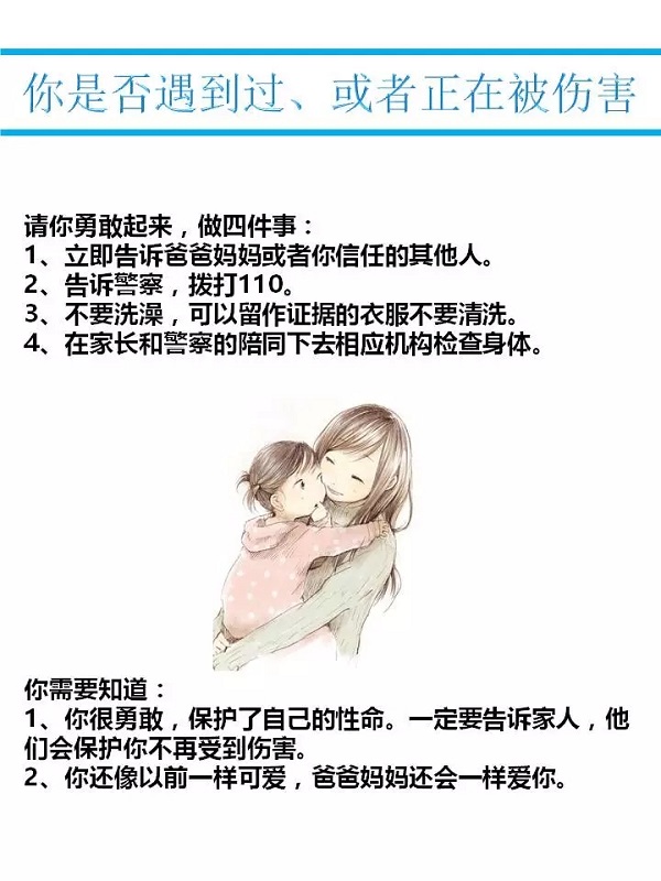孩子需要有辨别坏人的能力,更需要有对坏人说“不”的勇气。保护儿童任重道远,这不仅是社会的责任、法律的义务、学校的职责,也是每一个爸爸妈妈必须倾尽心力做到的事情。所以星空体育应该告诉孩子,无论他面对什么困难和问题,只要不是主动伤害别人,爸爸妈妈会永远相信她、保护她,孩子也应该要勇敢对坏人说“不”,不受坏人的威胁,有什么一定要和爸爸妈妈讲,相信爸爸妈妈会永远保护她!