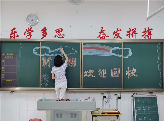 新学期 新环境 新希望 老师正在布置精美的黑板报迎接同学们回校