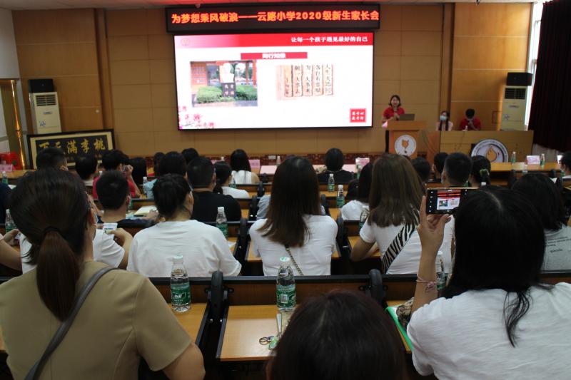星空体育的爸爸妈妈,在学校阶梯教室里面,看星空体育学校精彩的宣传视频