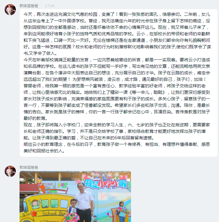 “今天的家长会有特别多的感动,整场下来热泪盈眶,之前因为对学校的不了解,心中多少有些迷茫,但是今天听完邹校长对学校教育理念的讲解和看到优秀的教师团队,我爱上了这所学校,鑫诚很幸运能进入这个友爱和温暖的大家庭”