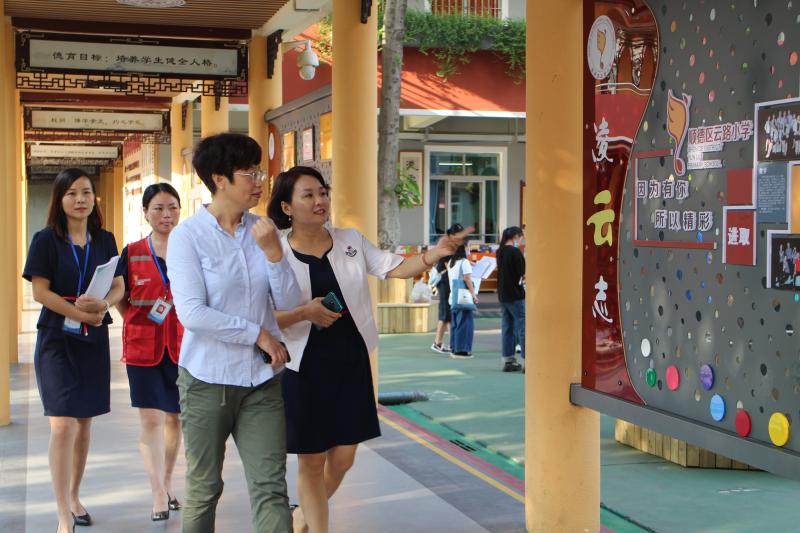 评估期间,顺德区教育局督导室高波主任也莅临我校进行巡视。高科长询问学校教育教学管理情况,她大为赞赏我校精心布置的校园文化与美丽的校园环境,并不时拍照留念。她认为云路小学是一所有书香味、舒适优雅的学校。