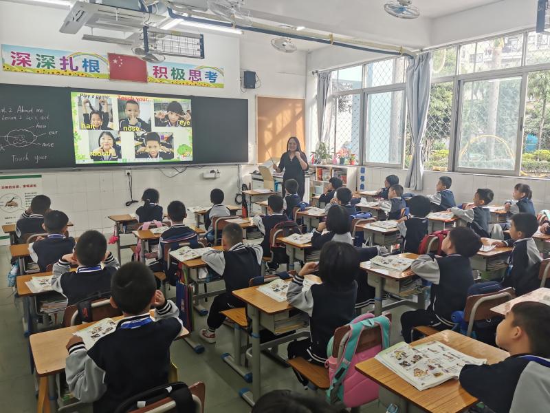 曾淑娟老师借助学生熟悉的卡通动漫人物和学生头像,设置小组分角色活动使他们在游戏的过程中加深词汇学习和动作指令运用,整体感知五官单词。