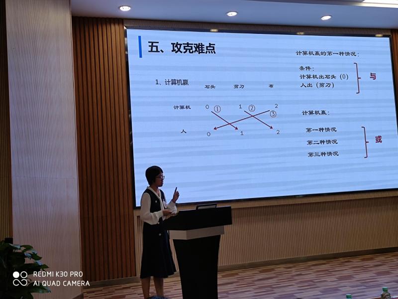 下午进行决赛,包括模拟课堂与答辩。内容为佛山市版信息技术教材八年级上册。按抽签顺序,提前40分钟进入备考室抽题、备课,然后进行模拟上课,模拟上课时间为10分钟,之后答辩时间2分钟。比赛中要求按一节课的教学容量模拟上课,体现完整的教学环节。选手们把自己精心准备的上课内容通过视频、课件、动画等形式展现出来。答辩环节主要包括教育教学常见问题及教育教学理念等,要求选手们结合上课内容或教学实践进行答辩,这一环节充分体现出选手们扎实的知识基础和丰富的教学经验。