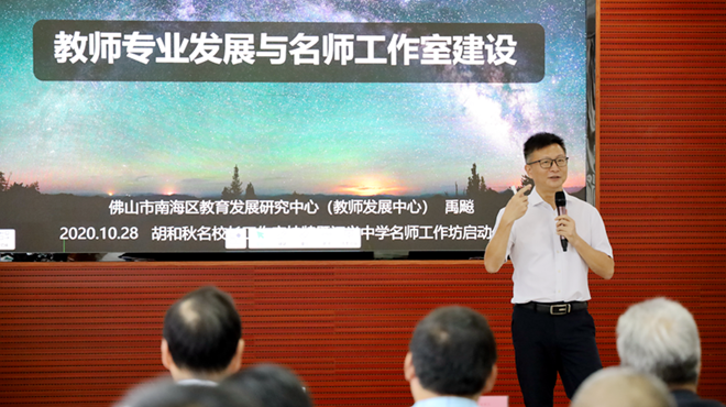 随后,南海区教育发展研究中心禹飚主任用充满中国哲学智慧的语言为各工作室成员作了题为《教师专业发展与名师工作室建设》的讲座。他指出,教师是实现百年教育大计的根本,教师的专业发展程度决定了教育的质量。要实现教师专业发展的高质量,必须明晓“道”不易、清楚“法”简易、做到“术”变易。名师工作室是促进教师专业发展的一种有效方式,工作室应该成为专业学习的共同体,成员应该有成为名师的期望,提升方式要多样。他还用典型的名师工作室的案例加深和强化大家的认识。讲座结束前他指出,将满怀期待我校的名校长工作室和名师工作坊能为创建品牌标杆学校提供强劲动力。