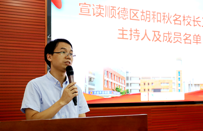 顺德区教育发展中心教师发展研究室唐信焱主任宣读顺德区胡和秋名校长工作室主持人及成员,并向他们颁发聘书。