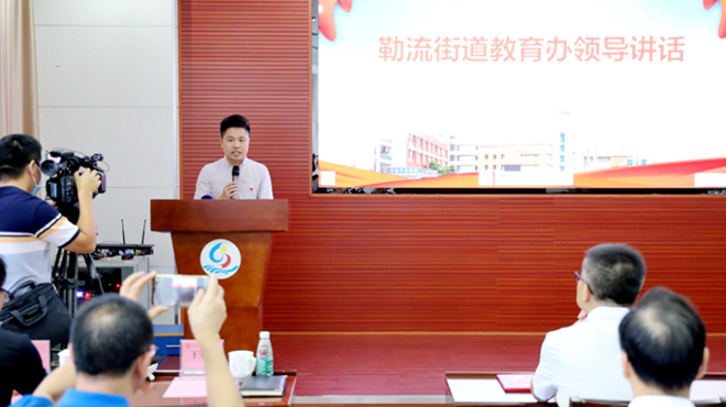 在仪式上,勒流街道教育办王家伦主任肯定了近年来江义中学的办学成绩,希望名校长工作室和工作坊的负责人能把工作室、工作坊搞好,不断学习,开拓创新,发挥引领作用,为街道、为顺德区培养一批优秀的名教师、名校长,助推勒流街道和顺德区教育的进步。