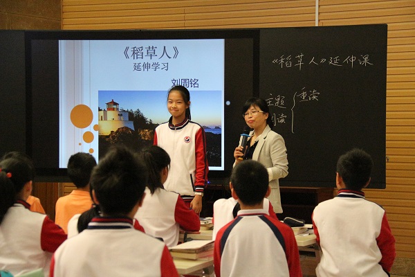 第一环节是杨倩桢名师工作室与顺德区曾雯名师工作室的成员献课,第一节授课的是碧桂花城学校的郭园主任。她上的是《稻草人》整本书阅读的延伸课。在此之前,她上过了《稻草人》整本书的推进课和分享课。这次的延伸课,她希望学生通过重读,能从读懂一本书到读懂一类书,学会主题阅读。课堂的重点环节是学生的分享,课前郭主任布置学生重读了一些童话书,要求他们学着用PPT,以童话三要素为主线,梳理自己的阅读感受,然后投票选出优秀作品,得票数前三的学生现场展示PPT,并且把感受说给大家听。课堂的另一个重点环节是阅读比较,把叶圣陶先生的童话跟其他作家的童话比较,找出所有不同的比较对象,以同一比较对象为标准,现场进行组队,十秒选出组长和记录员,每组发一张用于比较阅读的思维导图,进入小组合作学习。老师大胆的设计、学生们的精彩的分享获得了老师和专家们的高度赞誉!