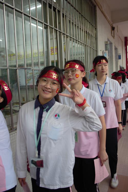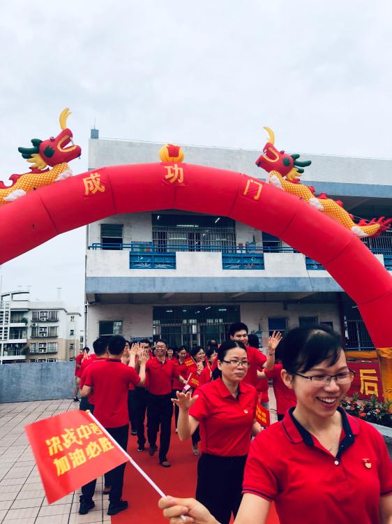 瞬时,同学们那渴望而又激动的眼神聚焦于“成功门”,仿佛那就是心之所盼的未来!各班的领队同学都默默地紧握班旗的旗杆,在班主任的带领下,同学们整理好额上的红丝带,边气势如虹地高喊口号边有序地走过“成功门”。“成功门”两侧早有初三级的科任老师列队静候着,他们为初三学子摇旗呐喊,击掌壮行,为这庄严的场面增添了一份温情!