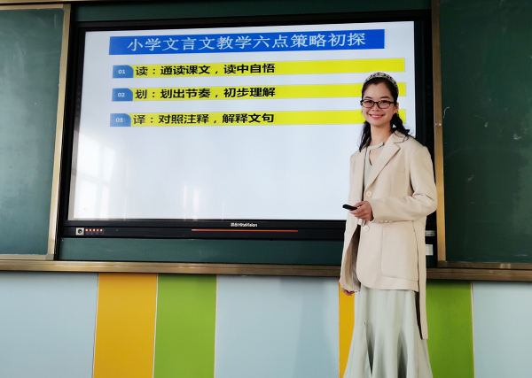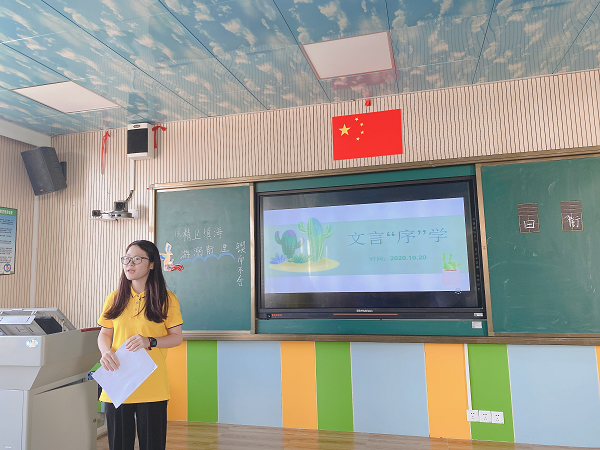 紧接着,北海小学甘容老师、梁毅钰老师作代表,分别围绕“小学文言文教学六点策略初探”和“文言‘序’学”这两个主题分享教学心得。本次分享起到了一个抛砖引玉的作用,为接下来的小古文教学提供了一个新的思考方向。